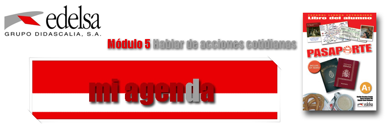 07 guía Esta secuencia didáctica está diseñada para una sesión de 1 hora. Se propone un trabajo autónomo, por lo que la evaluación se centrará en el resultado (la ficha de trabajo que se enviará al profesor). Se propone que durante el desarrollo de la tarea 1 el profesor tenga un papel activo para dirigirla o que se realice en plenaria. Se ponen en práctica las competencias, funciones y contenidos del módulo 5 del manual Pasaporte, especialmente los léxicos (verbos de acciones cotidianas, partes del día, días de la semana, meses del año) y gramaticales (verbos irregulares en presente). |
